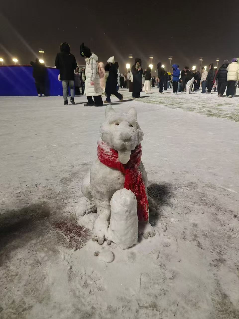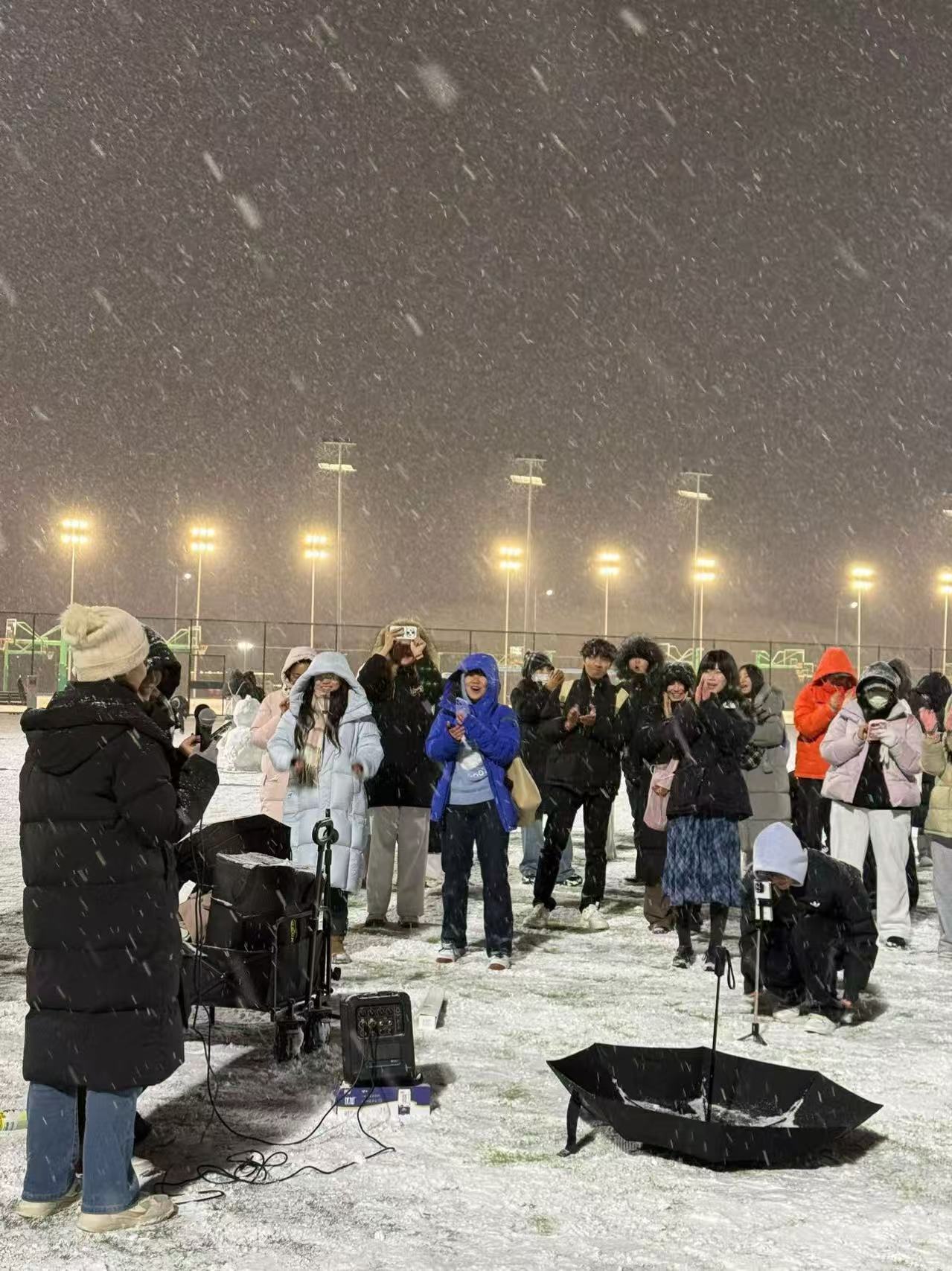 白天一直在想我的衣服裤子能不能防水,天黑前都没有走出室外。直到刚刚,舍友跟我说操场好多人。然后我想,那还是去看一看吧!于是穿上羽绒和靴子,轻飘飘地走出宿舍大门。来到操场——太喜欢你民建在宿舍楼前的操场,触手可及。这对于散步的人很重要。