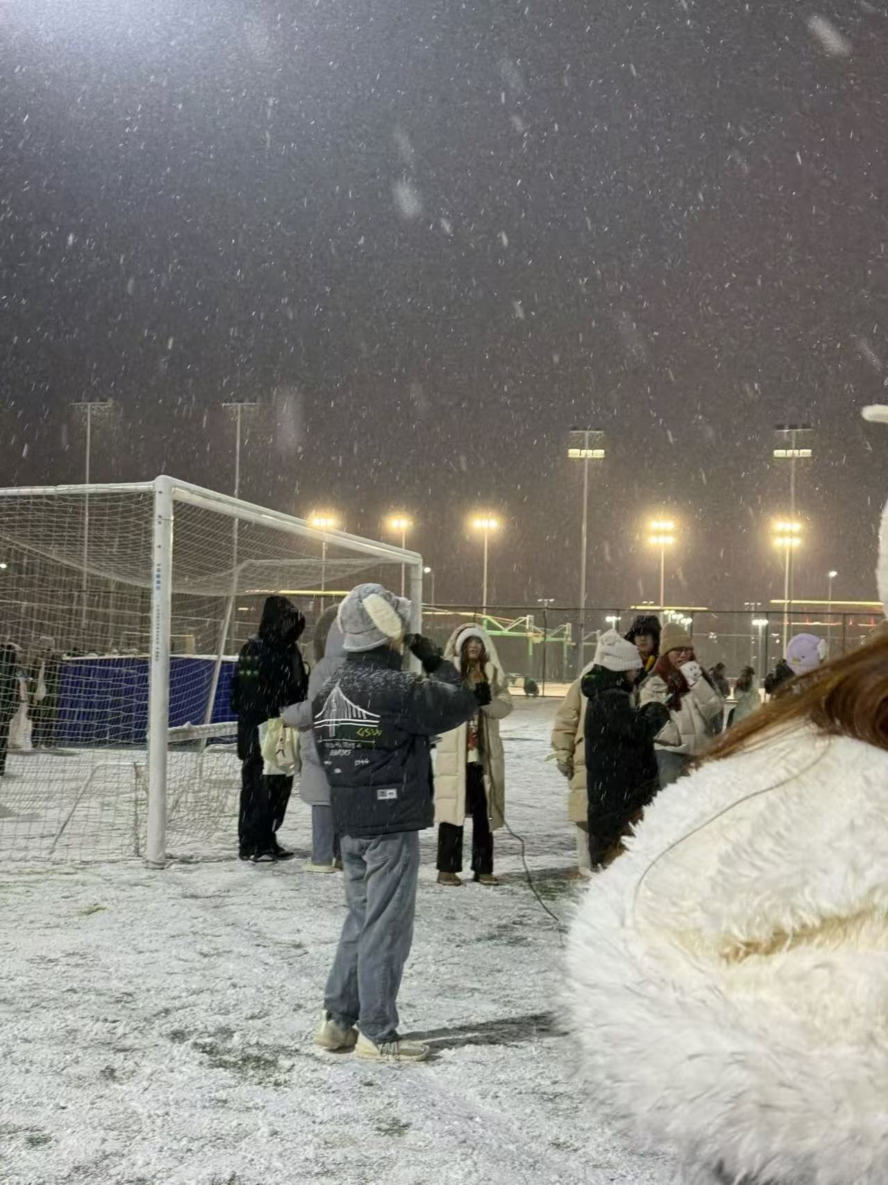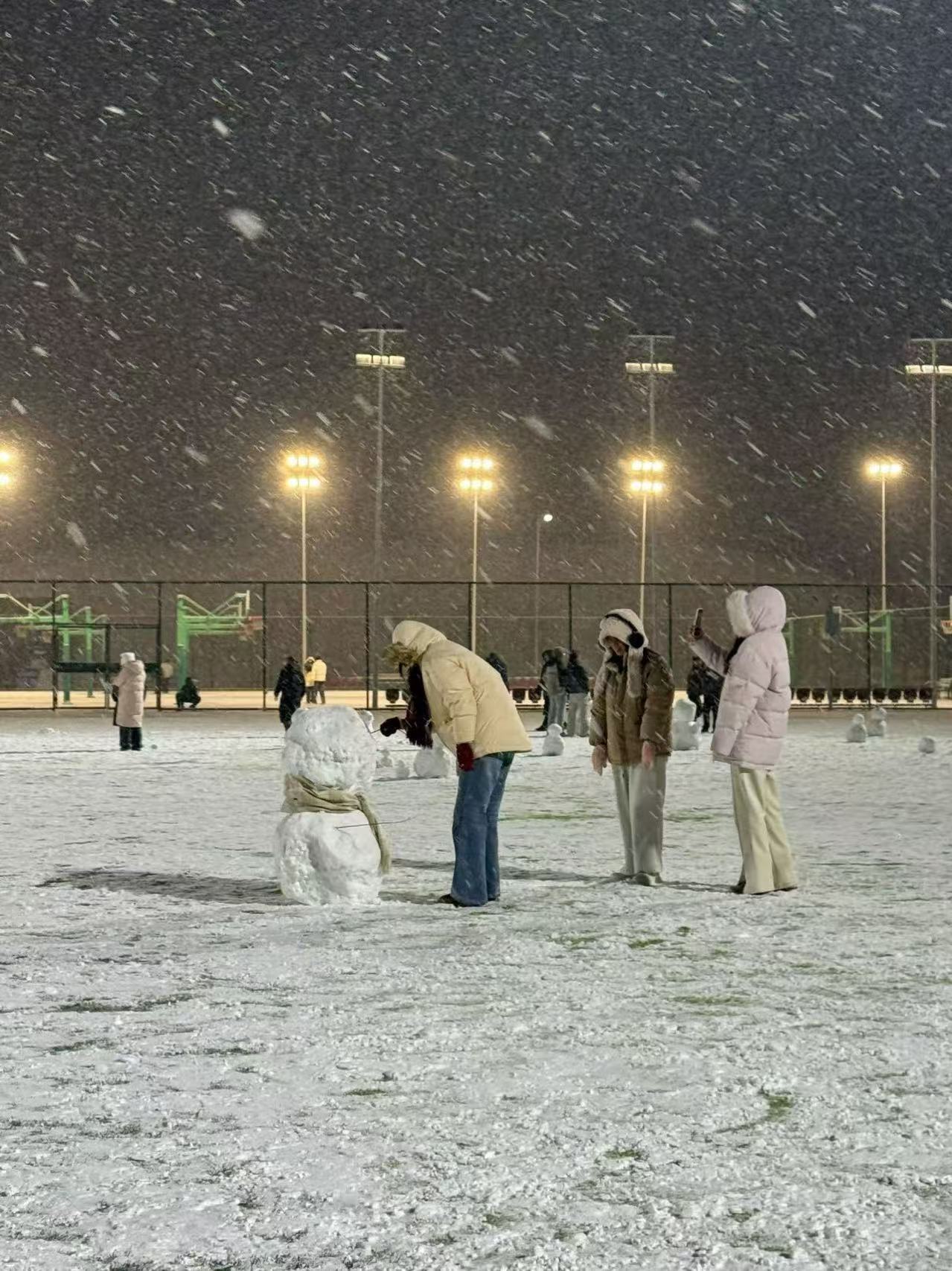 写完字后我来到了操场——果不其然有很多人,大家三三两两站在四处,有的在拍照,有的在玩雪。我和勒哥还有肖哥约好在操场碰面,大家一起玩耍、拍照。是的,我们宿舍只有三个南方人,我来自广东,勒哥来自四川,肖哥来自贵州,见了「大雪」都激动不已,只有在内蒙长大的硕哥来自北方并对此无动于衷。