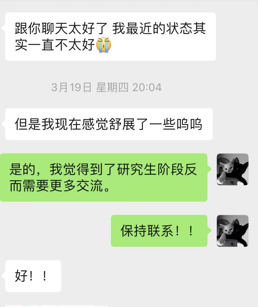 以前我认为读研就是一场「寂寞的旅途」,以后工作了更是要面对漫长的孤独,这是成长的必经之路,因此所有对孤独的拒绝和反抗都被我视作不同程度的逃避和软弱。但作为人,就是要相互联系、相互支持啊,这本身就是一种强有力的力量,也是一种不可多得的幸运。