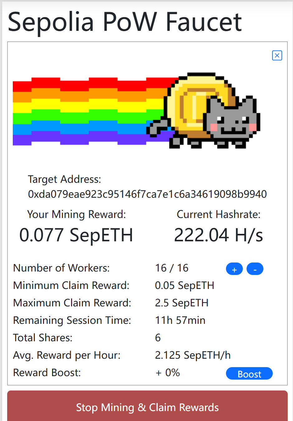 该网站也叫「水龙头」,领取测试币的过程则被称作「领水」,在该网站中输入自己的 Sepoia 测试地址,然后 start minting,水龙头就可以启动 Pow(Proof of Work)来开始挖矿,获得 SepETH。背后的运行规则是浏览器持续运行挖矿脚本,这需要消耗 CPU 算力,同时 SepETH 也会不断增加,等到一定量以后停止挖矿,便会获得相应量的测试币。一般来说,0.05 - 0.1 SpeETH 可以部署 1 - 2 个合约,0.2 - 0.5 SepETH 可以进行多次部署和交互,0.5 - 1 ETH 则可以用于长期开发了。